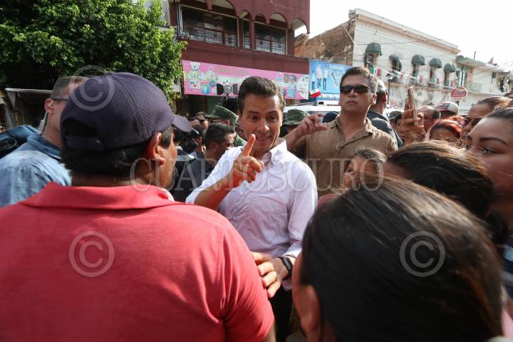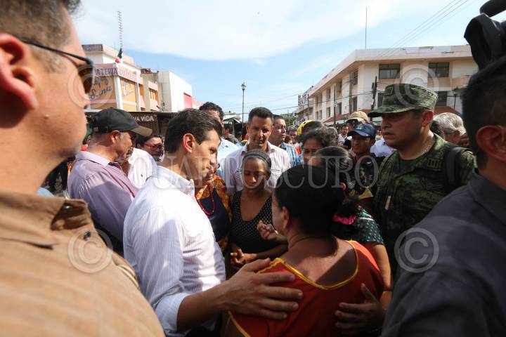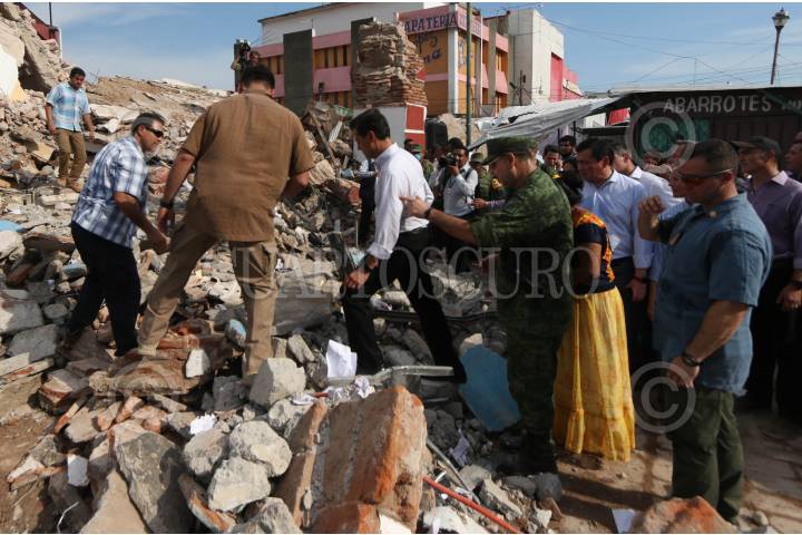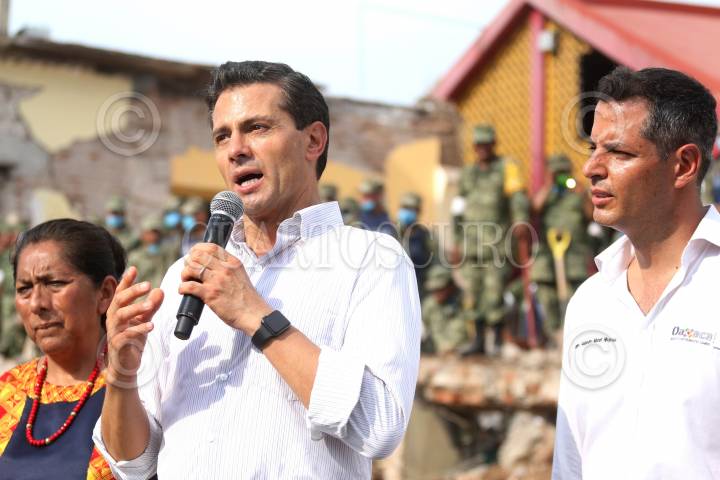 JUCHITÁN DE ZARAGOZA, OAXACA,08SEPTIEMBRE2017.- El presidente de la República, Enrique Peña Nieto realizó una gira de trabajo en el Istmo de Tehuantepec, donde visitó el municipio de Juchitán de Zaragoza sitio en el que perdieron la vida 35 personas a causa del terremoto 8.2 grados en la escala de Richter ocurrido la noche del pasado jueves, el ejecutivo quien estuvo acompañado del gobernador, Alejandro Murat, el titular de la Segob, Miguel Ángel Osorio Chong, el del la SEP, Aurelio Nuño y de SAGARPA, José Calzada, entre otros declaró el 8 de septiembre como día de luto nacional por esta tragedia y se comprometió a que todo el apoyo de su administración llegará a Juchitán para su reconstrucción. FOTO: ARTURO PÉREZ ALFONSO/ CUARTOSCURO.COM