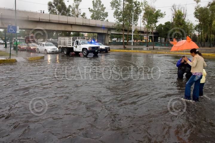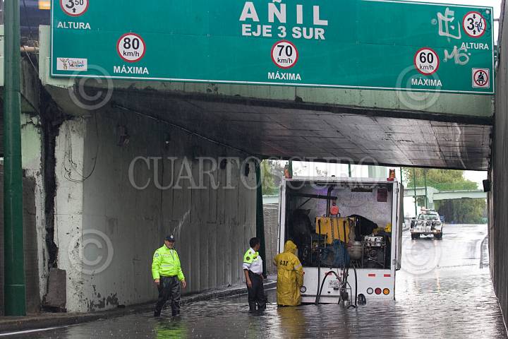 MÉXICO, D.F., 23JUNIO2011.- Una camioneta quedo varada en la parte baja del puente de Añil sobre Viaducto en la colonia Granjas México de la Delegación Iztacalco. La intensa lluvia que se registro por algunas horas provoco que las partes bajas del viaducto y de algunas de las principales avenidas del Distrito Federal quedaran con severos encharcamientos. FOTO: LUIS CARBAYO/CUARTOSCURO.COM