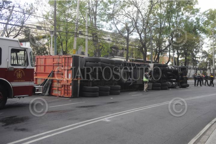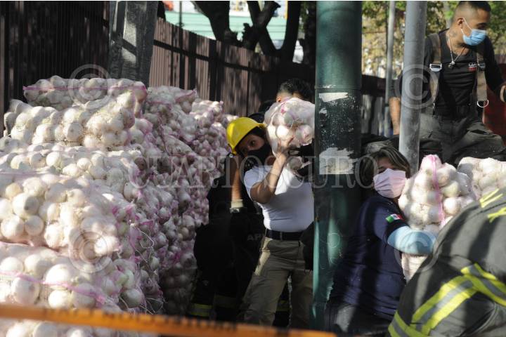 Un trailer que transportaba cebollas volcó en una curva en avenida Añil, en la alcaldía Iztacalco. No se reportaron heridos.