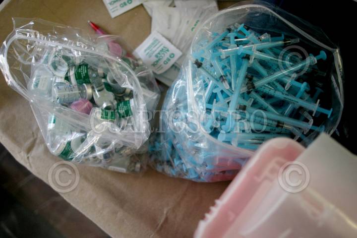 MÉXICO, D.F., 19ENERO2009.- La Secretaría de Salud del Distrito Federal, inició una campaña de vacunación en diferentes estaciones del metro de la capital contra el virus de la Influenza A-H1N1. Niños y Adultos son los más vulnerables a contraer este virus, por lo tanto son los mas vacunados. En la imagen, cientos de jeringas las cuales fueron utilizadas. FOTO: MISAEL VALTIERRA/CUARTOSCURO.COM