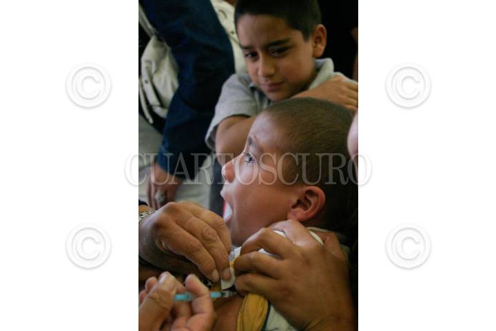 MÉXICO, D.F., 19ENERO2009.- La Secretaría de Salud del Distrito Federal, inició una campaña de vacunación en diferentes estaciones del metro de la capital contra el virus de la Influenza A-H1N1. Niños y Adultos son los más vulnerables a contraer este virus, por lo tanto son los mas vacunados. En la imagen, un niño es vacunado en la estación observatorio. FOTO: MISAEL VALTIERRA/CUARTOSCURO.COM