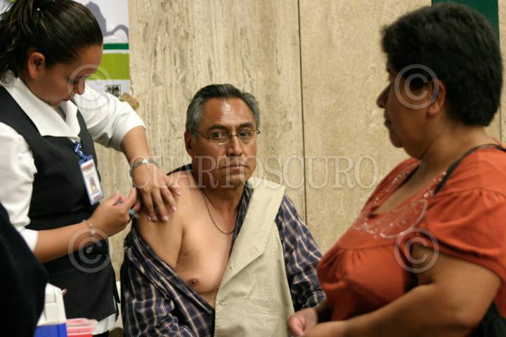 MÉXICO, D.F., 19ENERO2009.- La Secretaría de Salud del Distrito Federal, inició una campaña de vacunación en diferentes estaciones del metro de la capital contra el virus de la Influenza A-H1N1. Niños y Adultos son los más vulnerables a contraer este virus, por lo tanto son los mas vacunados. En la imagen una enfermera aplica la vacuna en la estación observatorio. FOTO: MISAEL VALTIERRA/CUARTOSCURO.COM