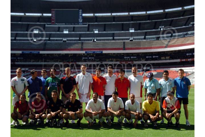 MÉXICO, D.F., 13MARZO2008.- Pilotos que participarán en la formula A1G, este fin de semana sostuvieron una cascarita con comentaristas de deportes en la cancha del Estadio Azteca. FOTO: IVÁN MENDEZ/CUARTOSCURO.COM