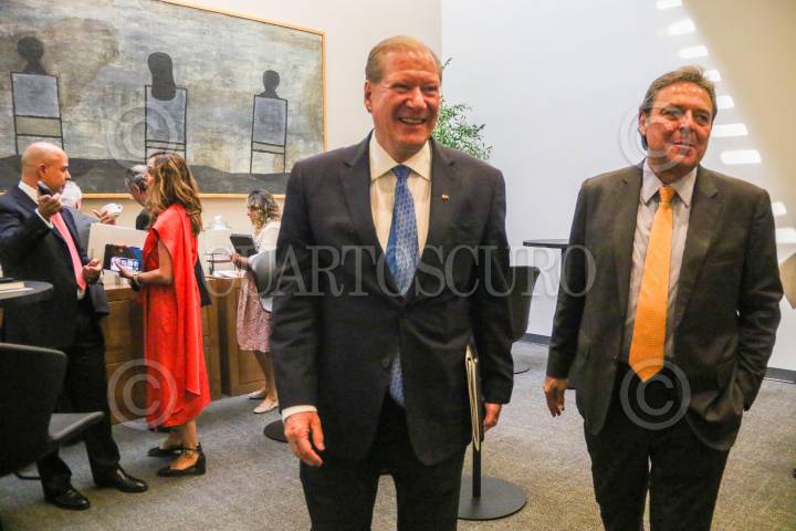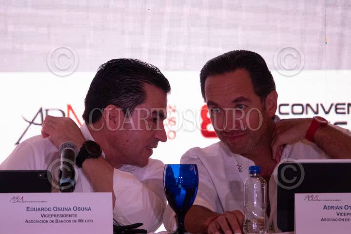 Eduardo Osuna, director General de BBVA Bancomer, y Adrián Ottero, director general de Scotiabank, conversaron durante la 85 Convención Bancaria