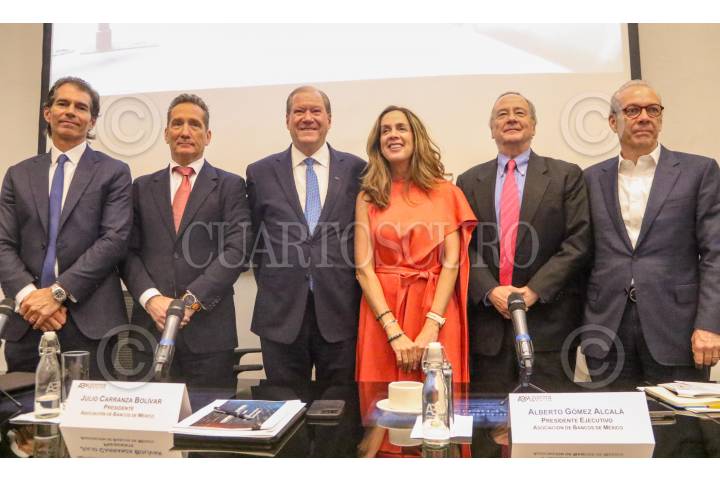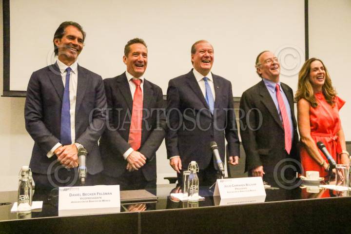 CIUDAD DE MÉXICO, 12JUNIO2024.- Raúl Martínez-Ostos Jaye, vicepresidente de la ABM; Alberto Gómez Alcalá, presidente ejecutivo de la Asociación de Bancos de México; Julio Carranza Bolívar, presidente de la Asociación de Bancos de México (ABM); Eduardo Osuna, vicepresidente de la ABM, y Fernando Solís Cámara, enlace legislativo de la ABM, ofrecieron una conferencia de prensa en la cual hablaron sobre la Reforma al Poder Judicial que ha propuesto el gobierno federal y aplaudieron la iniciativa de la Presidenta Electa, Claudia Sheinbaum, de abrir el análisis y el dialogo en torno a ellas a los diversos sectores. También señalaron que la actual volatilidad en el tipo de cambio del dólar se debe al período de transición, algo que consideraron de normal, pero que ellos ven a un México en calma y así lo indican los diversos anuncios de inversiones que se han dado recientemente. FOTO: MOISÉS PABLO/CUARTOSCURO.COM