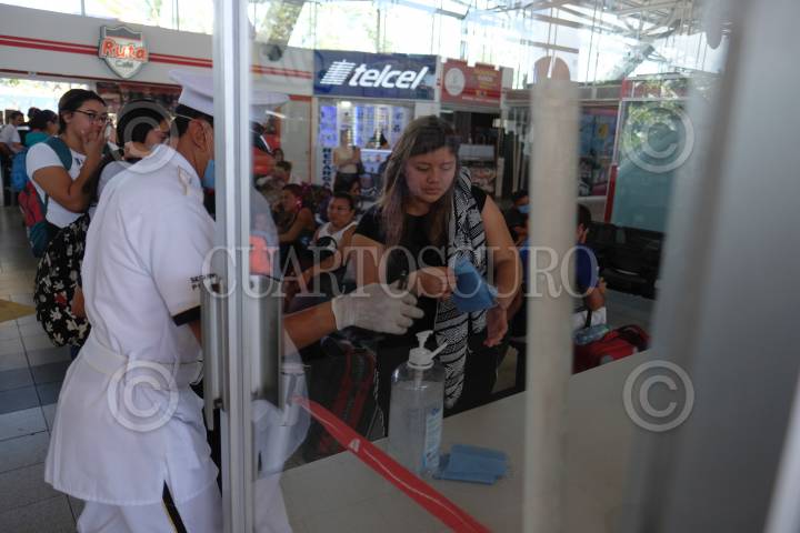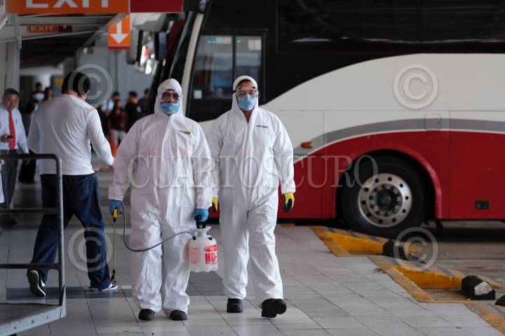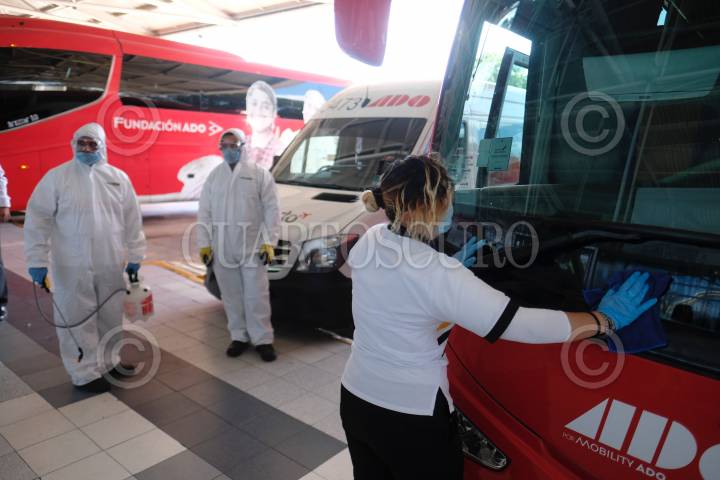 En la terminal del ADO en Cancún personal desinfecta las áreas comunes a fin de evitar la propagación del Covid 19