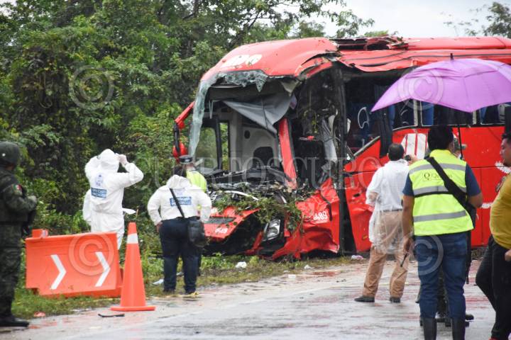 Al menos ocho personas murieron y 19 resultaron heridas a causa de la volcadura de un camión de pasajeros de la ADO, en la carretera de cuota Mérida-Cancún, en el cruce de la vía El Tintal-Playa del Carmen.