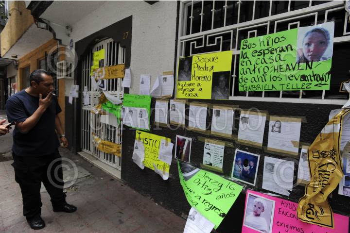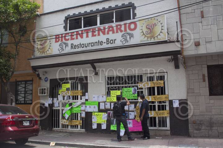 MÉXICO, D.F., 31MAYO2013.- La fachada del Bicentenario Restaurante Bar y que en su interior se ubica el llamado after "Heaven" ha sido tapizada por carteles en donde se busca a los 12 jóvenes que supuestamente fueron extraídos por un comando de este lugar el domingo pasado por la madrugada. También se observan los sellos de la Procuraduría General de Justicia del DF los cuales fueron colocados por el delito de privación ilegal de la libertad, en su fachada se observan dos cámaras que están en desuso, al lugar llegan curiosos, se sabe que dos los padres de dos de estos jóvenes purgan condenas por el delito de crimen organizado. FOTO: MOISÉS PABLO /CUARTOSCURO.COM