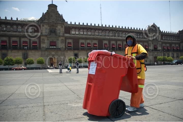 MÉXICO, D.F., 03MAYO2009.- Un trabajador de limpia pasa en por la plancha del Zócalo capitalino con un contenedor especial para recoger desechos infecciones como son Muy pocas personas acuden al Zócalo de la ciudad, muchas de ellas usan cubre bocas, el uso del cubre bocas en áreas en donde se congregan muchas personas se recomienda como medida para evitar la propagación del virus de la influenza humana AH1N1. FOTO: RODOLFO ANGULO/CUARTOSCURO.COM