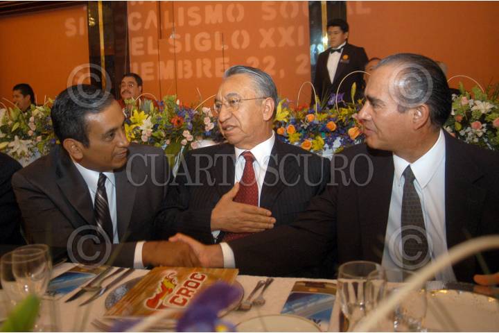 MÉXICO D.F. 22SEPTIEMBBRE2006.- El empresario Ernesto Chacón del grupo ALSEA, Isaias González Cuevas, presidente nacional de la CROC, y el secretario de trabajo de Queretaro, Rafael Camacho, durante la ceremonia del 97 de aniversario de esta organización en un lujoso hotel de la zona de Polanco. FOTO: GUILLERMO PEREA/CUARTOSCURO.COM