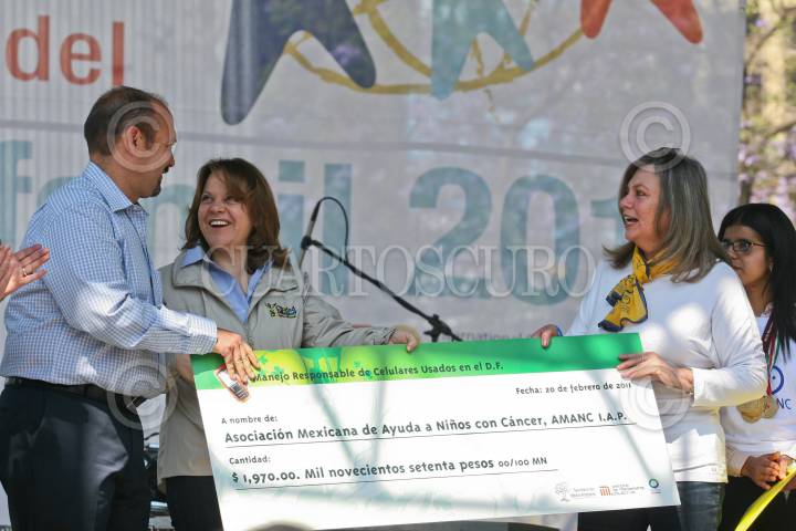 MÉXICO, D.F., 20FEBRERO2010.- Martha Delgado, secretaria de Medio Ambiente, entregó un donativo a Guadalupe Alejandre, fundadora de la Asociación Mexicana de Ayuda a Niños con Cáncer, AMANC, durante la conmemoración del Día Internacional del Cáncer Infantil, en la glorieta del Ángel de la Independencia. FOTO: ISAAC ESQUIVEL/CUARTOSCURO.COM