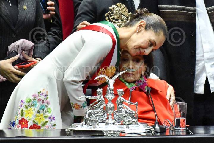 CIUDAD DE MÉXICO, 01OCTUBRE2024.- Claudia Sheinbaum, presidenta de México, abraza a Ifigenia Martínez, presidenta de la mesa directiva, durante la sesión de Congreso General realizada en la Cámara de Diputados. FOTO: MARIO JASSO/CUARTOSCURO.COM