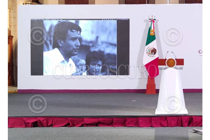 CIUDAD DE MÉXICO, 13NOVIEMBRE2024.- La imágen del ex presidente de México, Andrés Manuel López Obrador, fue colocada en las pantallas de la conferencia matutina de la presidenta, Claudia Sheinbaum, luego de que se retirara del salón, esto en el marco de su cumpleaños 71. FOTO: DANIEL AUGUSTO/ CUARTOSCURO.COM
