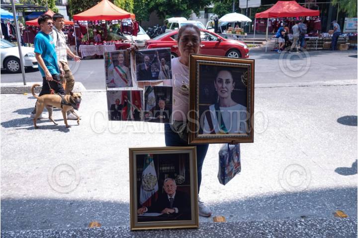 CIUDAD DE MÉXICO, 04MAYO2025.- Una vendedora ofrece fotografías afuera del World Trade Center de Claudia Sheinbaum, presidenta de México y de su antecesor Andrés Manuel López Obrador. FOTO: GRACIELA LÓPEZ/CUARTOSCURO.COM