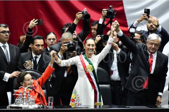CIUDAD DE MÉXICO,01OCTUBRE2024.- Claudia Sheinbaum, primera presidenta constitucional de los Estados Unidos Mexicanos; Ifigenia Martínez, presidenta de la mesa directiva de la Cámara de Diputados; Andrés Manuel López Obrador, expresidente de México, y Gerardo Fernández Noroña, presidente de la Mesa directiva del Senado de la República, durante la entrega de banda presidencial en la Cámara de Diputados. FOTO: GRACIELA LÓPEZ/CUARTOSCURO.COM