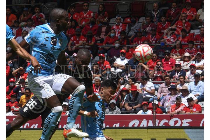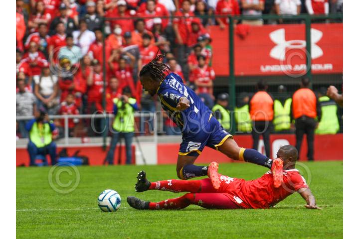 Andrés Mosquera defensa de los Diablos de Toluca pelea el esférico con Kevin Balanta medio de Gallos Blancos de Querétaro durante el encuentro en el estadio Nemesio Diez.