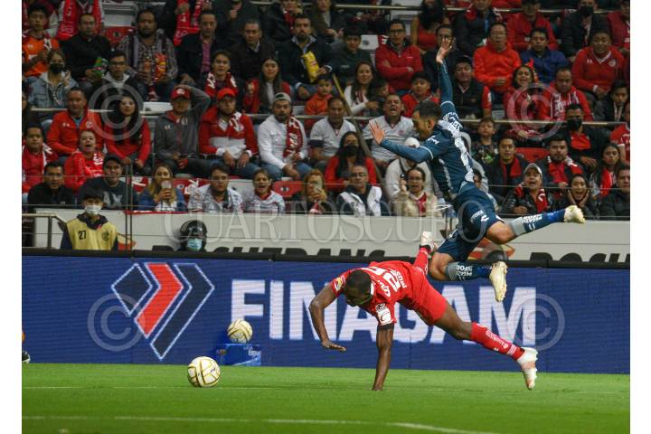 Andrés Mosquera defensa de los Diablos del Toluca y Gustavo Cabral defensa de los Tuzos de Pachuca durante el partido de ida de la Final del Torneo Apertura 2022 de la Liga MX.