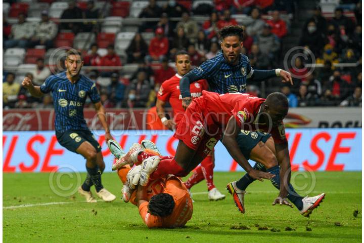 Óscar Jiménez portero de las Águilas del América pelea el balón con Andrés Mosquera defensa de los Diablos de Toluca en la Copa Sky.