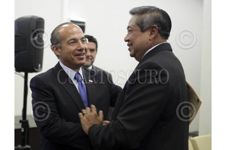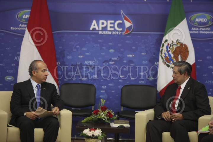 VLADIVOSTOK, RUSIA/ 9DESEPTIEMBRE2012. -Felipe Calderón Hinojosa durante la reunión bilateral con John Key, primer ministro de Nueva Zelandia, la cual tuvo lugar en el Salón de Bilaterales del Edificio B en Nueva Zelandia. FOTO: ARIEL GUTIÉRREZ /CUARTOSCURO.COM