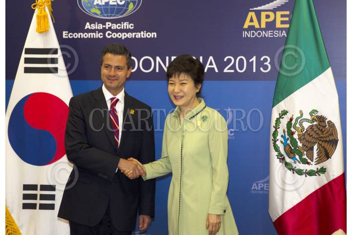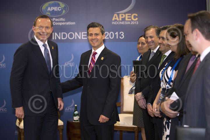 BALI, INDONESIA, 07OCTUBRE2013.- Como parte de sus actividades dentro de la Reunión de Líderes del Foro de Cooperación Económica Asia-Pacífico (APEC), el Presidente de México, Enrique Peña Nieto, sostuvo encuentros bilaterales con la Presidenta de Corea, Park Geun-hye; y con el Primer Ministro de Australia, Tony Abbott. FOTO: PRESIDENCIA /CUARTOSCURO.COM