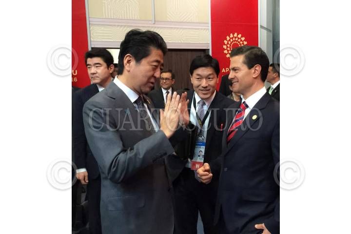 LIMA, PERÚ, 19NOVIEMBRE2016.- Presidente Enrique Peña Nieto conversó con el Primer Ministro de Japón, Shinzo Abe, después de su participación en la Reunión de Líderes de TPP que se realizó como parte de las actividades de la Reunión de Líderes del Foro de Cooperación Económica Asia-Pacífico (APEC). FOTO: PRESIDENCIA/ CUARTOSCURO.COM
