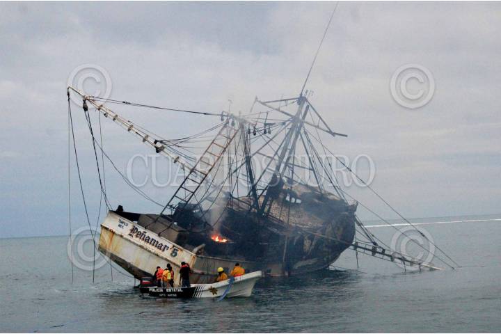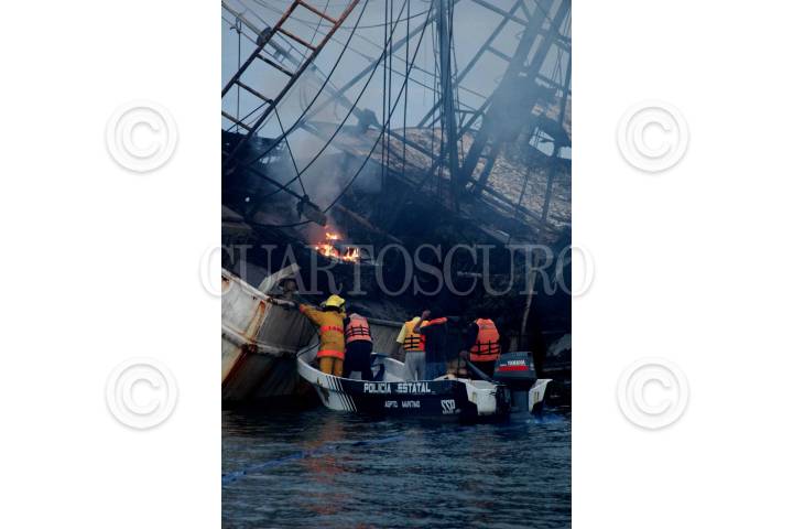 VERACRUZ, VERACRUZ06DICIEMBRE2006.- El barco pesquero "Peñamar" procedente de Tampico encalló ayer en la zona arrecifal de Veracruz debido al mal tiempo y esta mañana se incendio por lo que elementos de la Secretaria de Marina y bomberos de APIVER realizaron maniobras para sofocar el fuego. FOTO: ISAAC AGUILAR/CUARTOSCURO.COM