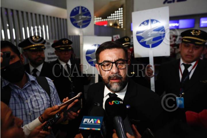 CIUDAD DE MÉXICO, 02OCTUBRE2018.-Rafael Díaz Covarrubia, secretario general de la Asociación Sindical de Pilotos Aviadores de México (ASPA) en conferencia de prensa después de haberse realizado la “Asamblea de Pilotos de Aeroméxico” en la que se determinó un acuerdo sobre la negociación contractual con Aeroméxico que representa un aumento del 5.15%, por lo cual la aerolínea no entrará en huelga. FOTO: MARIO JASSO /CUARTOSCURO.COM