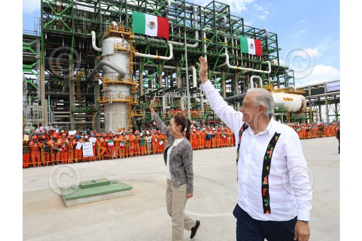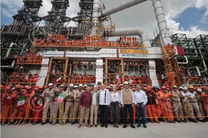 ATITALAQUIA, HIDALGO, 13JULIO2024.- Julio Menchaca, gobernador de Hidalgo; Claudia Sheinbaum, virtual presidenta electa; Andrés Manuel López Obrador, presidente de México, y Octavio Romero Oropeza, director general de Petróleos Mexicanos (Pemex), encabezaron la supervisión de la Planta Coquizadora de la Refinería de Tula de Allende. FOTO: PRENSA CLAUDIA SHEINBAUM/CUARTOSCURO.COM