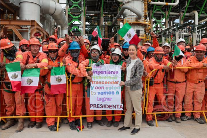 ATITALAQUIA, HIDALGO, 13JULIO2024.- Claudia Sheinbaum, virtual presidenta electa, saluda a trabajadores durante la supervisión de la Planta Coquizadora de la Refinería de Tula de Allende. FOTO: PRENSA CLAUDIA SHEINBAUM/CUARTOSCURO.COM