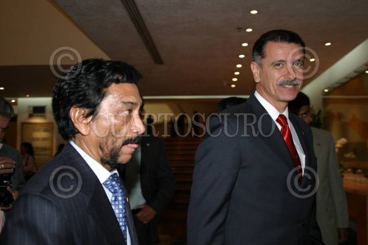 MEXICO, D.F. 30MARZO2005.- Victor Flores y Carlos Abascal, lider del sindicato de trabajadores y secretario del Trabajo respectivamente. en espera del presidente Vicente Fox en un hotel de Polanco. FOTO: Sandra Perdomo/CUARTOSCURO.COM