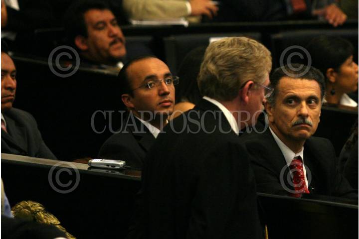 MÉXICO, D.F. 17SEPTIEMBRE2008.- El panista Carlos Abascal Abascal y Javier González Garza, coordinador parlamentario del PRD en la Cámara de Diputados durante el primer informe del jefe de gobierno capitalino Marcelo Ebrard Casaubón, en la Asamblea Legislativa. FOTO: PAOLA HIDALGO/CUARTOSCURO.COM