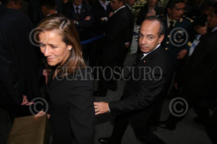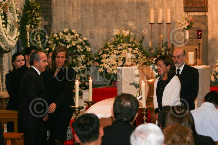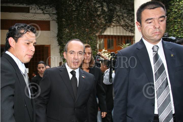 MÉXICO D.F., 02DICIEMBRE2008.- El presidente, Felipe Calderón Hinojosa, acompañado de su esposa Margarita Zavala, acudió esta tarde al Convento de la Visitación de María, donde se realizo una misa de cuerpo presente y se velan los restos de Carlos Abascal, quien fuera Secretario de Gobernación, durante la gestión de Vicente Fox. FOTO: GUILLERMO PEREA/CUARTOSCURO.COM