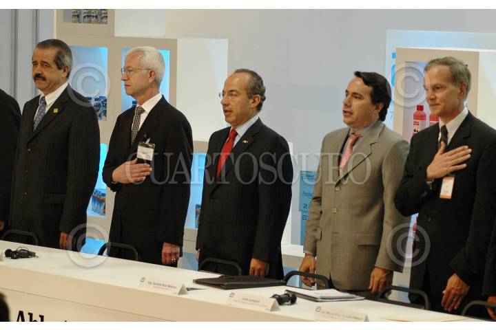 MÉXICO, D.F., 10JUNIO2009.- José Angel Cordova Villalobos, secretario de Salud; Holger Liepmann, presidente global de Abbott Nutrición; el presidente Felipe Calderón y Gerardo Ruíz Mateos, secretario de economía durante la inauguración de la planta Abbott. FOTO: RODOLFO ANGULO/CUARTOSCURO.COM