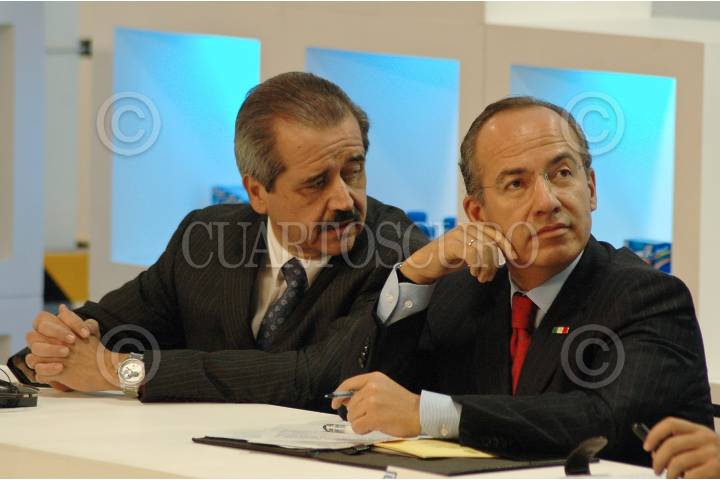 MÉXICO, D.F., 10JUNIO2009.- José Angel Cordova Villalobos, secretario de Salud conversa con el presidente Felipe Calderón durante el evento inaugural de la planta Abbott. FOTO: RODOLFO ANGULO/CUARTOSCURO.COM