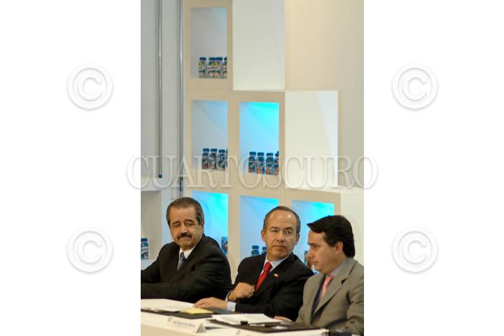 MÉXICO, D.F., 10JUNIO2009.- José Angel Cordova Villalobos, secretario de Salud; el presidente Felipe Calderón y Gerardo Ruíz Mateos, secretario de economía durante la inauguración de la planta Abbott. FOTO: RODOLFO ANGULO/CUARTOSCURO.COM
