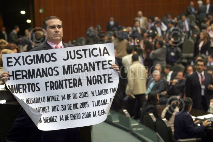 MEXICO, D.F. 01FEBRERO2006.- El diputado Jose Manuel Abdala de la Fuente muestra una pancarta donde exige justicia para los migrantes. FOTO. Nelly Salas/CUARTOSCURO.COM