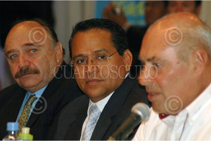 MÉXICO D.F., 23ENERO2008.-José Abed ; Juan Manuel Oliva, titular de la Federación Internacional de Automovilismo, Juan Manuel Oliva gobernador del estado de Guanajuato y Juan Seberville, presidente del comité organizador; durante la conferencia de prensa del Campeonato mundial de Rally México que se realizará del 28 de febrero al 2 de marzo en el estado de Guanajuato. FOTO: RODOLFO ANGULO/CUARTOSCURO.COM