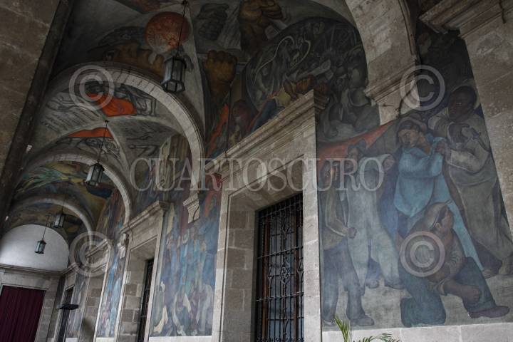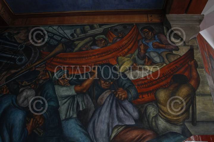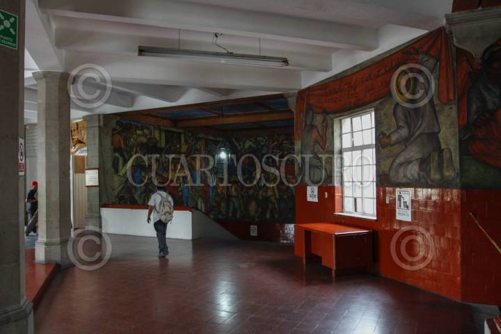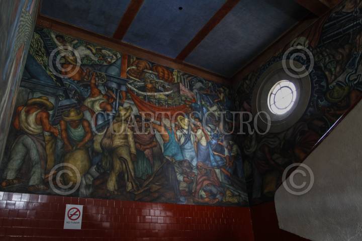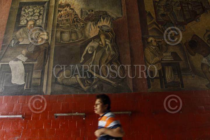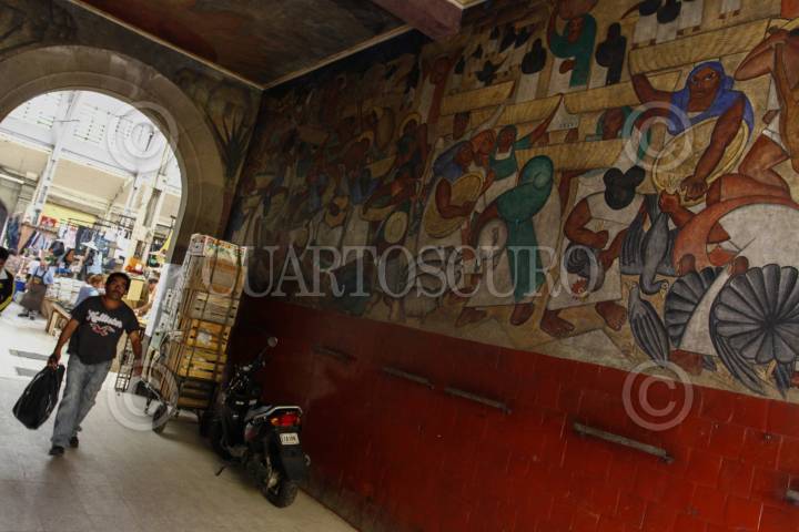 MÉXICO, D.F., 06AGOSTO2014.- Los muros internos del Mercado Presidente Abelardo L. Rodríguez resguardan los murales realizados por algunos discípulos de Diego Rivera. Construido en 1934 dentro del primer cuadro de la ciudad, el mercado tiene valor patrimonial porque contiene murales de Isamu Noguchi, Marion Greenwood, Pablo O'Higgins y Ángel Bracho. Los murales están distribuidos en los principales accesos, escaleras y primer piso. La temática de los murales es en torno a asuntos socialistas como la explotación de los trabajadores, campesinos y mineros; la lucha contra el nazismo y el fascismo, y la discriminación racial. FOTO: RODOLFO ANGULO /CUARTOSCURO.COM