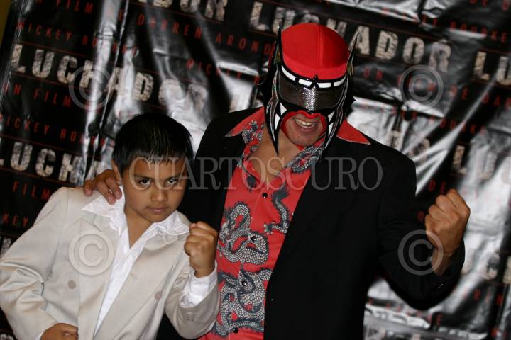 MÉXICO, D.F., 26FEBRERO2009.- El luchador Abismo Negro posa con su hijo a su llegada al cuadro rojo de la película "Luchador" que protagoniza Mickey Rourke, esto como parte de las actividades del FICCO 2009 en Cinemex Antara. FOTO: RODOLFO ANGULO/CUARTOSCURO.COM
