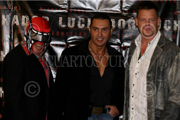 MÉXICO, D.F., 26FEBRERO2009.- Abismo Negro, Latin Lover y el Vampiro Canadiense durante el cuadro rojo de la pelicula "Luchador" que protagoniza Mickey Rourke, esto como parte de las actividades del FICCO 2009 en Cinemex Antara. FOTO: RODOLFO ANGULO/CUARTOSCURO.COM