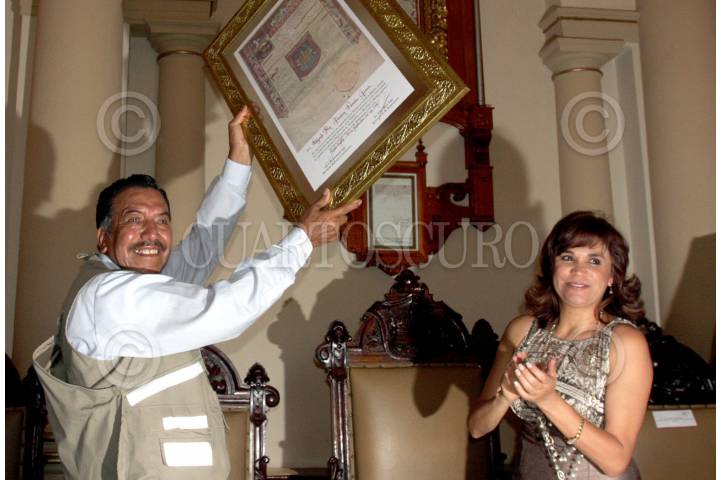 PUEBLA, PUEBLA, 30SEPTIEMBRE2009.- Abraham Paredes, reportero gráfico de La Jornada de Oriente, recibió de manos de la presidenta Municipal Blanca Alcala, la cédula real por 50 años de trayectoria profesional. FOTO: FRANCO/CUARTOSCURO.COM
