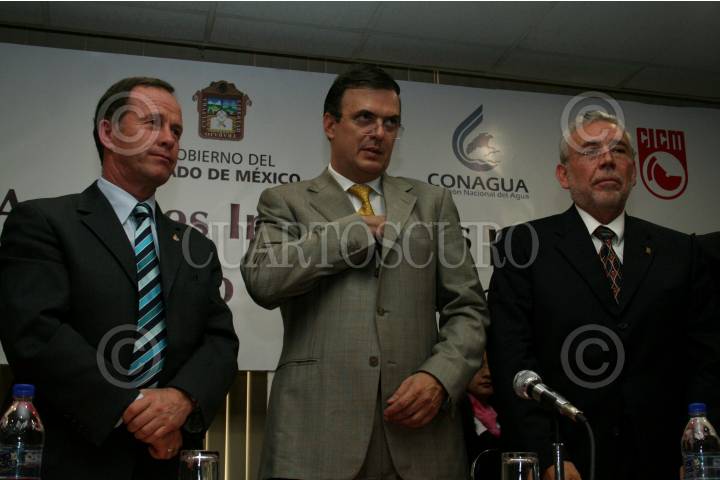 MÉXICO, D.F. 09MAYO2007.- El jefe de gobierno, Marcelo Ebrard Casaubón presentó su programa de mejora del drenaje capitalino. José Luis Luege Tamargo, director de la Comisión Nacional del Agua y José Elías Chedid Abraham, presidente del Colegio de Ingenieros del Estado de México estuvieron presentes. FOTO: PAOLA HIDALGO/CUARTOSCURO.COM