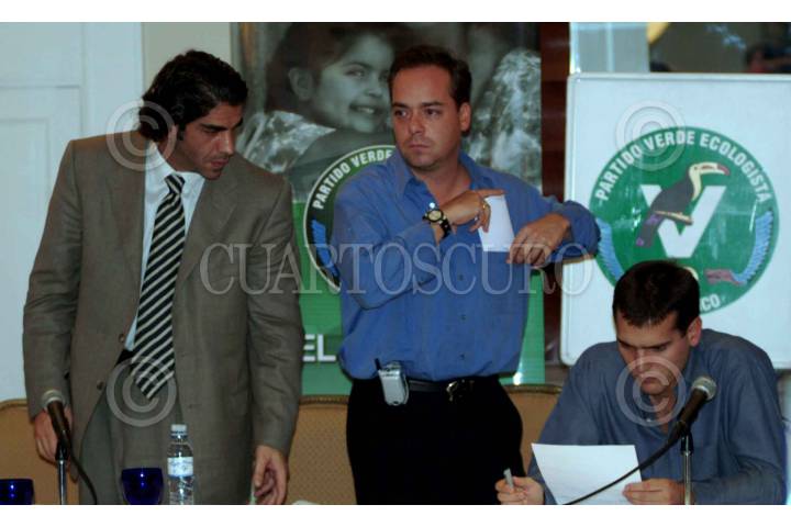Jorge Kahwagi, coordinador en la Cámara de diputados, Francisco Abundis, responsable de finanzas y Jorge Emilio González, presidente nacional del partido Verde Ecologista de México, al termino de la conferencia de prensa donde anunciaron que están en contra de redactar nuevamente los estatutos del partido y elegir una nueva dirigencia. FOTO: Nelly Salas/CUARTOSCURO.COM