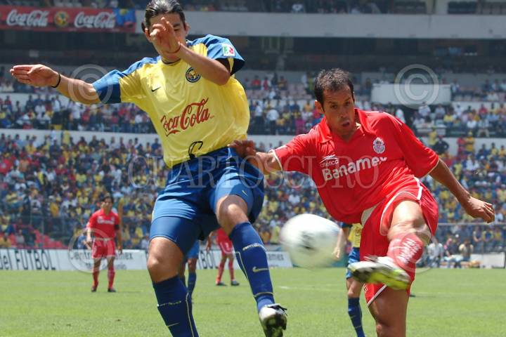 Toluca, Edomex, 27MAYO2004.- José Manuel Abundis, delantero del Toluca y Ricardo Rojas, defensa del América, durante las acciones del partido que disputaron en la Bombonera. Los rojos lograron una victoria de 3-2. FOTO: Moisés Pablo/CUARTOSCURO.COM
