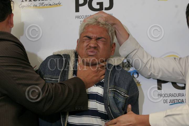 MÉXICO D.F., 20ABRIL2009.- Elementos de la procuraduria de justicia del Distrito Federal, presentaron ante los medios de comunicación a un sujeto que presuntamente se disfrazaba de mujer para atacar y acosar a mujeres en los vagones exclusivos para damas, del sistema de trasporte colectivo metro, de la ciudad de Mexico. FOTO: PGJDF/CUARTOSCURO.COM