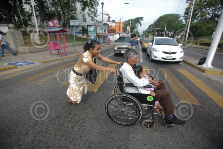 VILLAHERMOSA,TABASCO, 01MARZO2016.- Una hombre en silla de ruedas cruza la avenida de Paseo Tabasco, asistido por su pareja. FOTO: MARCO POLO GUZMÁN HERNÁNDEZ /CUARTOSCURO.COM