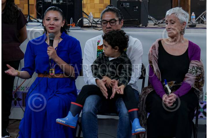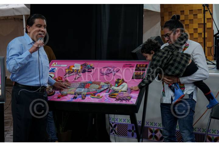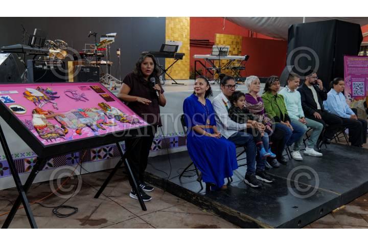 CIUDAD DE MÉXICO, 31 DE JULIO DE 2024 - Yessica Morales, directora del Museo Nacional de Culturas Populares; junto a Edgar Saner y Mali Haddad, presentaron la experiencia inmersiva del mural "Tejedores de sueños" para personas con discapacidad visual en el Museo de las Culturas Populares. Este mural, creado originalmente por los artistas plásticos mexicanos Saner y Sego, forma parte del proyecto "Cuéntame un mural", que tiene como objetivo hacer el arte accesible para personas con discapacidad visual. Para garantizar esta accesibilidad, la adaptación del mural no solo incluyó texturas, sino que también mantuvo los colores originales, permitiendo que quienes tienen baja visión puedan apreciarlo plenamente. FOTO: ALICE MORITZ/CUARTOSCURO.COM