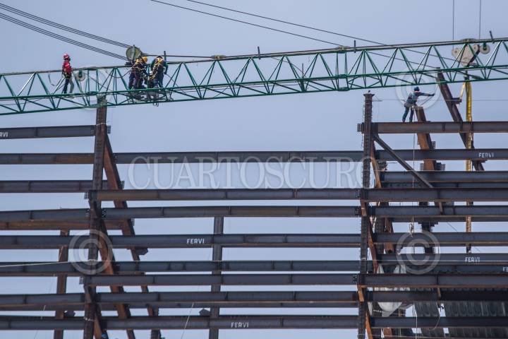 Obreros colocan vigas de acero para la construcción de un edifico en la colonia Tabacalera.