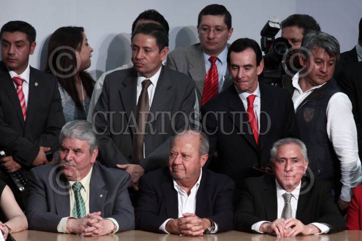 MÉXICO, D.F, 08ENERO2011.- El senador Carlos Aceves del Olmo, Carlos Romero Deschamps, secretario general del Sindicato de Petroleros y Joel Ayala, dirigente de la FSTSE durante la entrega de la constancia de mayoria a Humberto Moreira, gobernador con licencia de Coahuila y la diputada federal Cristina Díaz luego de que la Comisión Nacional de Procesos Internos declaró como válida y legítima su candidatura a la dirigencia nacional del Comité Ejecutivo Nacional del Partido Revolucionario Institucional (PRI). FOTO: RODOLFO ANGULO/CUARTOSCURO.COM