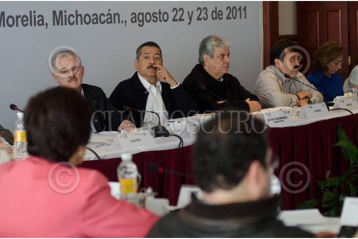 MORELIA, MICHOACAN, 23AGOSTO2011.- Francisco Labastida Ochoa, Manlio Fabio Beltrones, Carlos Aceves del Olmo, Renan Cleominio Zoreda Novelo y Rosario Green, durante la intervención de María de los Angeles Moreno durante los trabajos de la V Reunión Plenaria de los senadores del PRI en esta ciudad. FOTO: PEDRO VALTIERRA/CUARTOSCURO.COM
